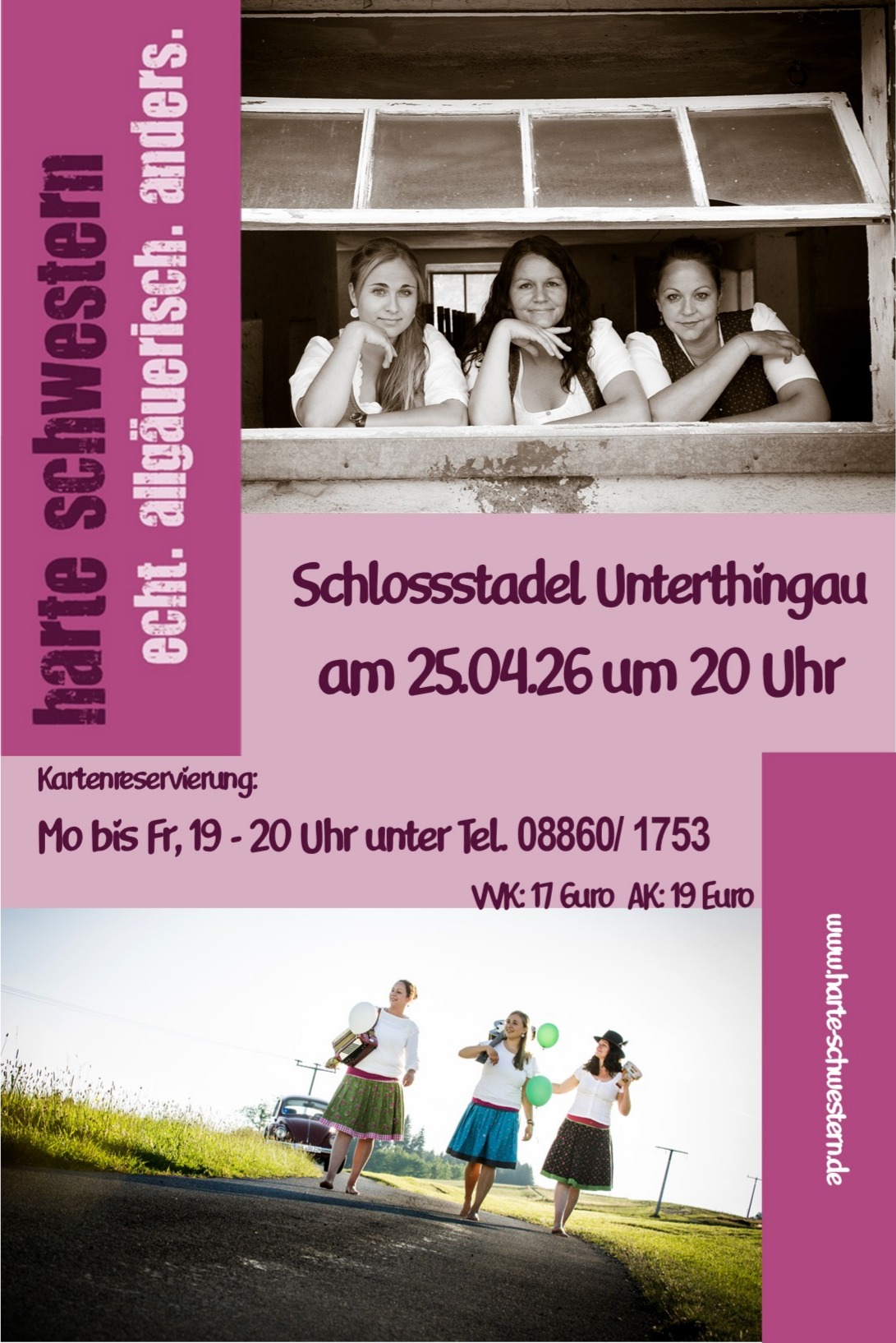 Event Konzert der "Harten Schwestern" am 25.04.2026 im Schloss-Stadel News VG - Unterthingau Markt Unterthingau Konzert der "Harten Schwestern" am 25.04.2026 im Schloss-Stadel 25. April 2026 Konzert der "Harten Schwestern" im Schloss-Stadel am 25.04.2026 Vorherige Artikel Nächster Artikel